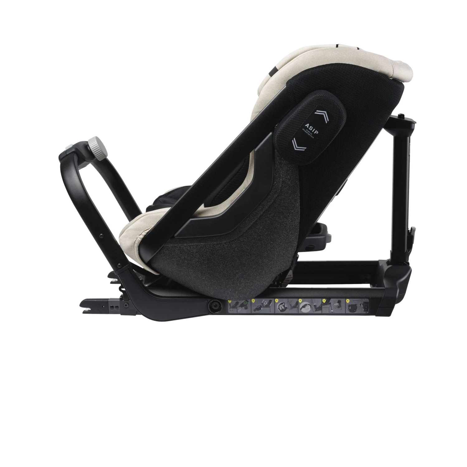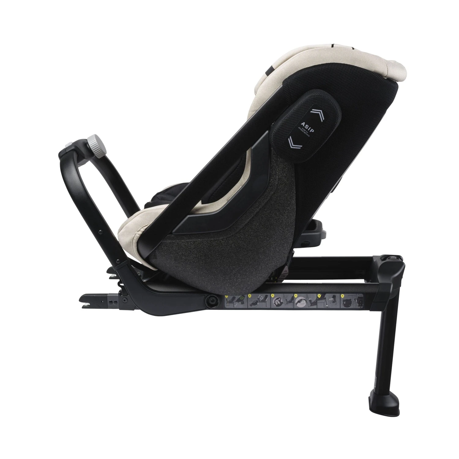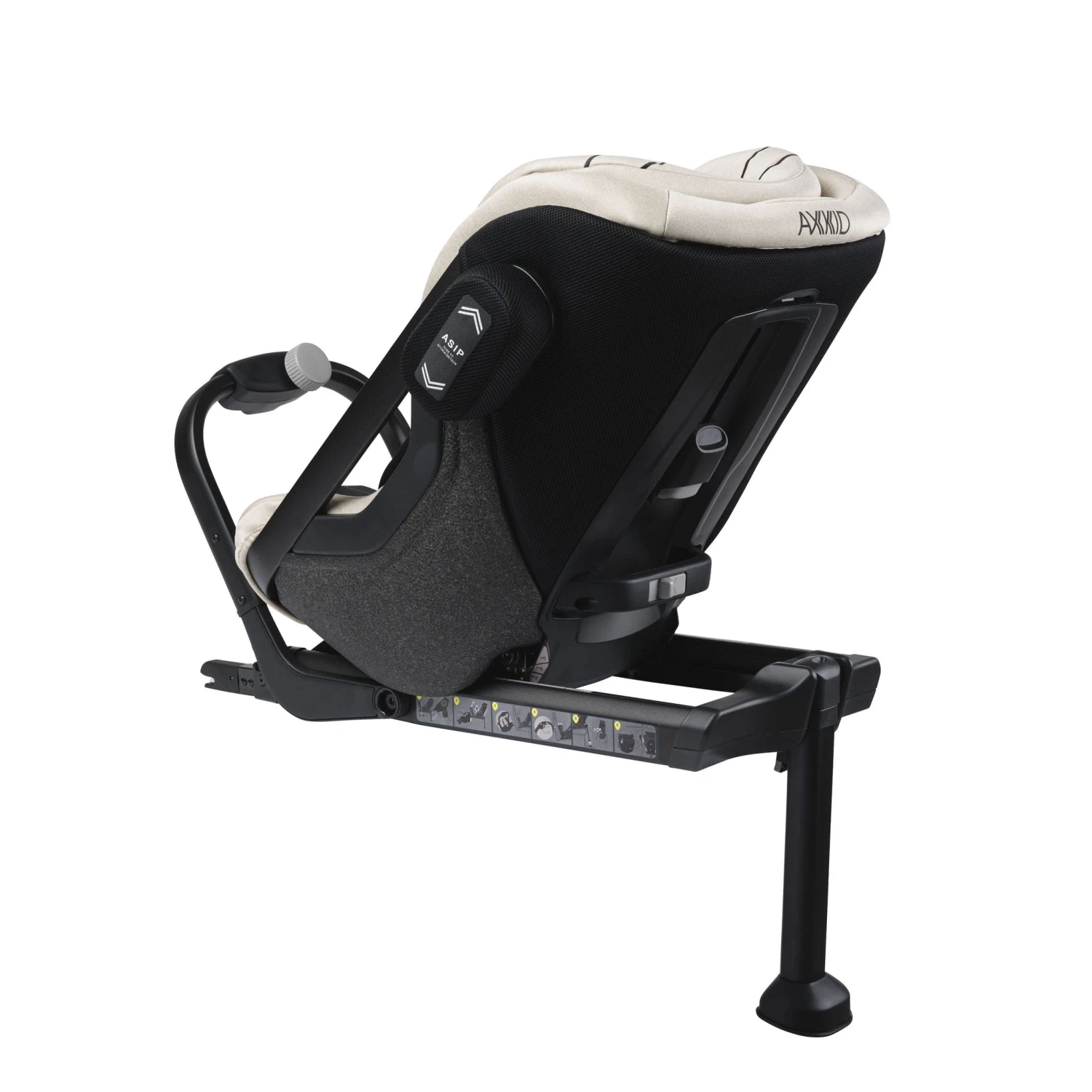 The Axkid One 2 features sliding seat technology, allowing the front seat passengers additional space by pushing the seat back towards the backseat – all made possible by the seat’s mounted rails that allow the seat to be adjusted back and forth for up to 30cm. For older children, the protective frame technology can act as a handle so they may easily climb in and out of the seat themselves. The One 2’s oversize design of the anti-rotation bar means that there is extra legroom so they can travel comfortably all the way to the maximum age.Â