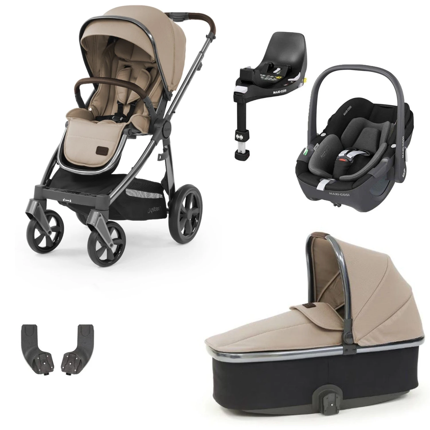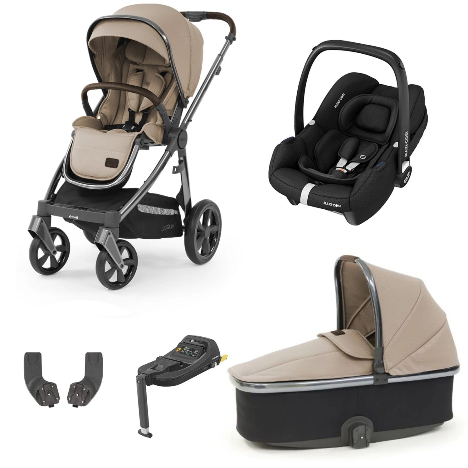 Whether travelling by car or out for a walk the Babystyle Oyster 3 Essential Bundle with a Chassis and Butterscotch Fabric provides you with everything you need. This bundle features the Oyster Pushchair, Carrycot, Car Seat Adaptors and Changing Backpack, as well as your choice of car seat. Choose between Capsule & Base, Cloud Z2 & Base, Cabriofix i-Size or the Pebble 360.Â