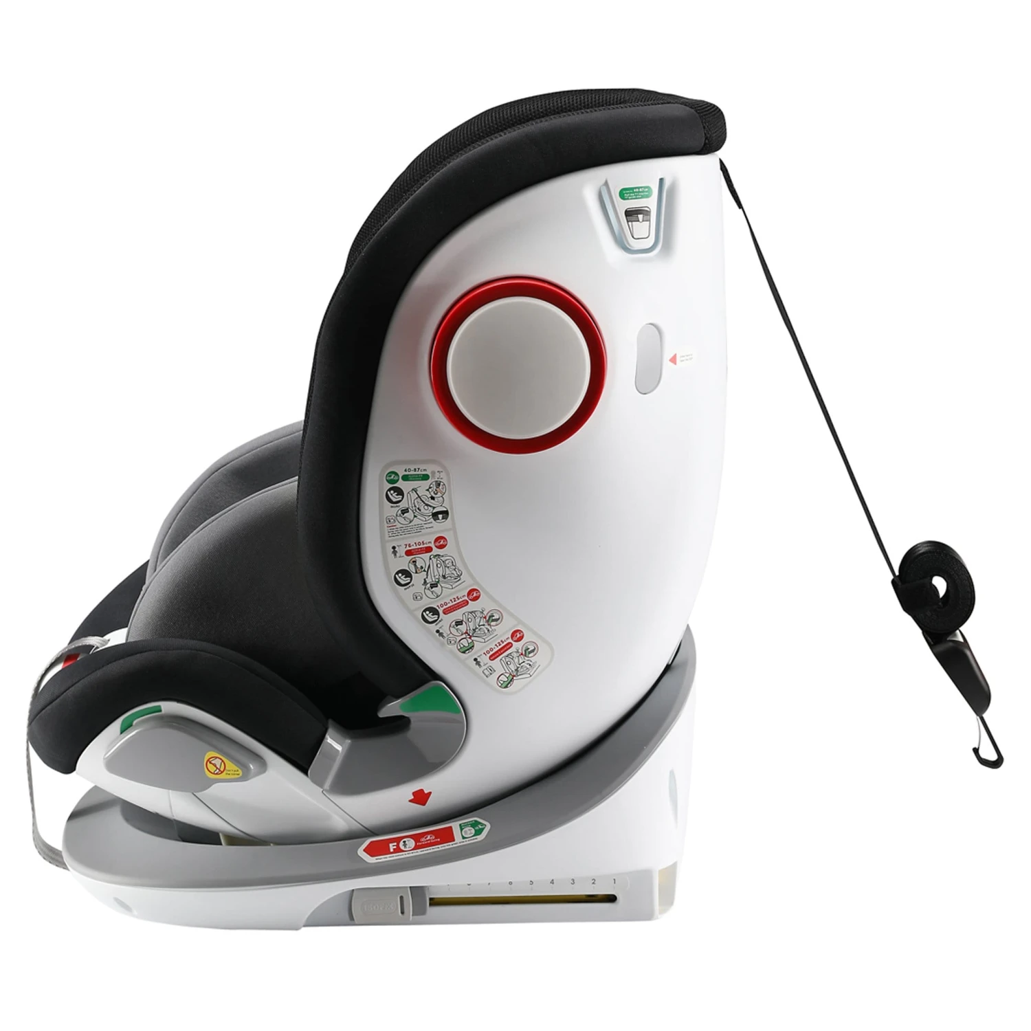 Designed with i-Size in mind the car seat can be used rear-facing up to 87cm or approx. 15 months. Then with the pull of a lever (located on both sides for your convenience), the seat will spin so your child can forward face when the time comes. The one-handed rotation feature allows you to rotate the seat which will semi-lock at 90° to allow you easy access to your little one when getting them in and out of the car. Complete with a 5 point harness with chest straps which can be used up to 105cm (18kg) and can be hidden to use the vehicle’s 3 point belt when your child outgrows it.