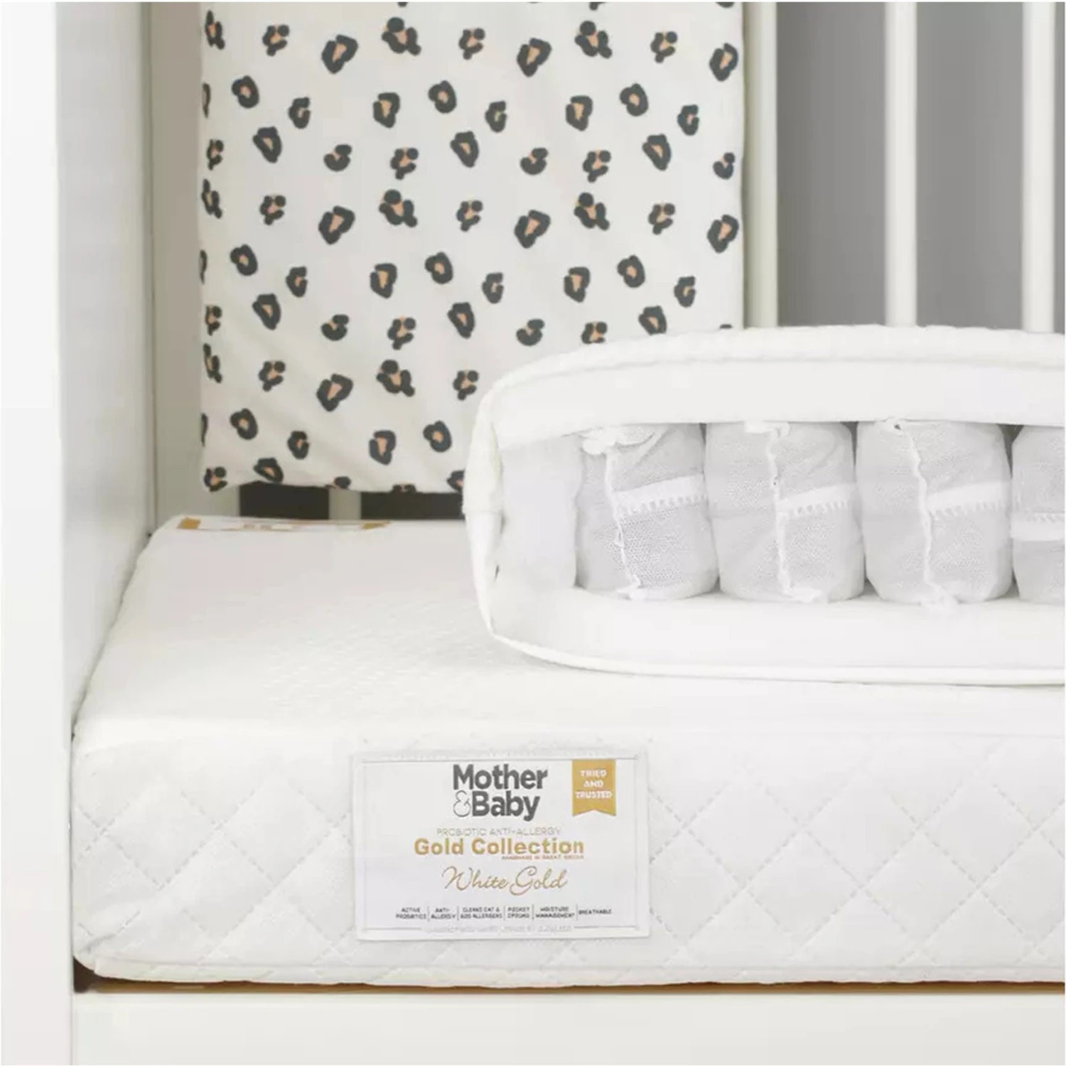The Mother&Baby Sprung Cot Bed Mattress has a handmade open coil spring system crafted from the highest grade materials to deliver long-lasting support for your baby.