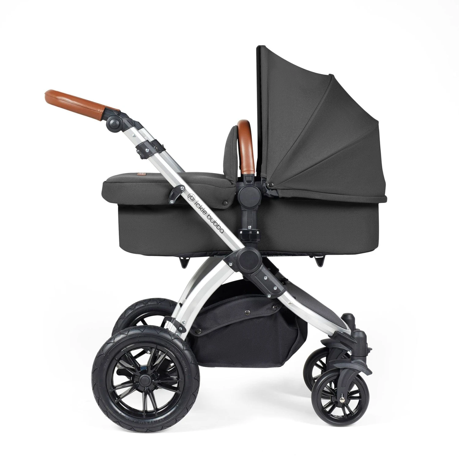 The Ickle Bubba Stomp Luxe All-in-One Travel System with Isofix Base – Silver/Midnight/Black is everything you need for your journeys with your new little one, this stroller can handle all terrains and with the car sunshades, foot warmer and rain cover this bundle is ready for any weather!