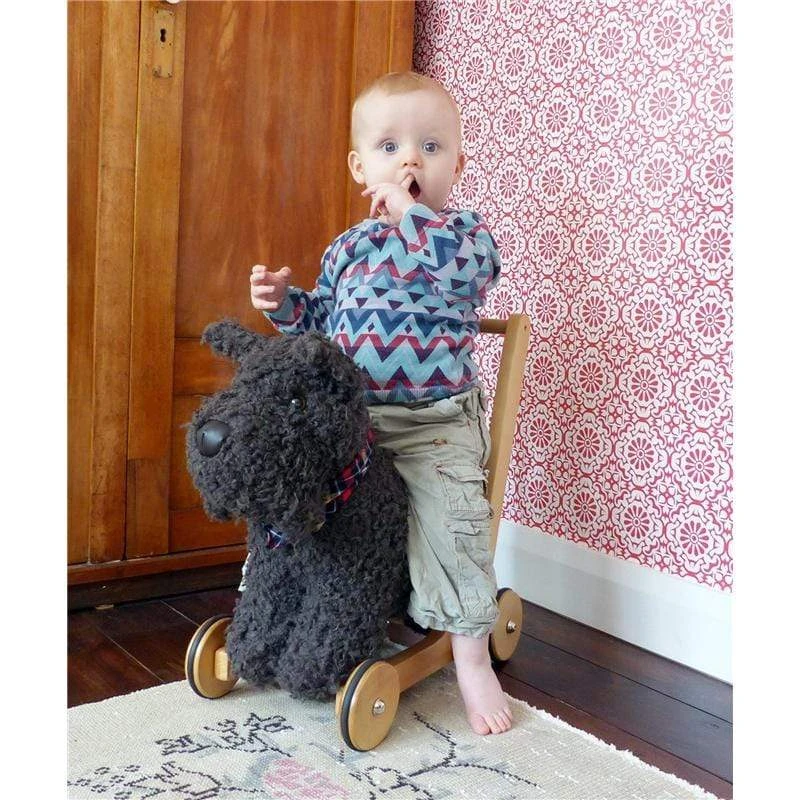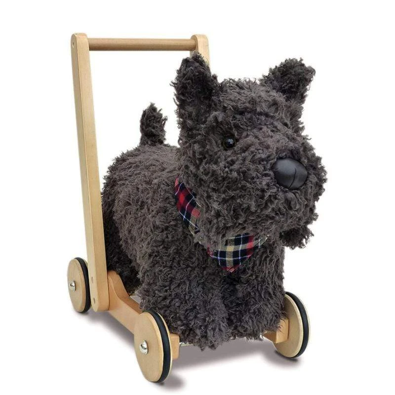 Scotty Dog is suitable from 12 months, as use as a pushalong walker or sit on ride along toy.