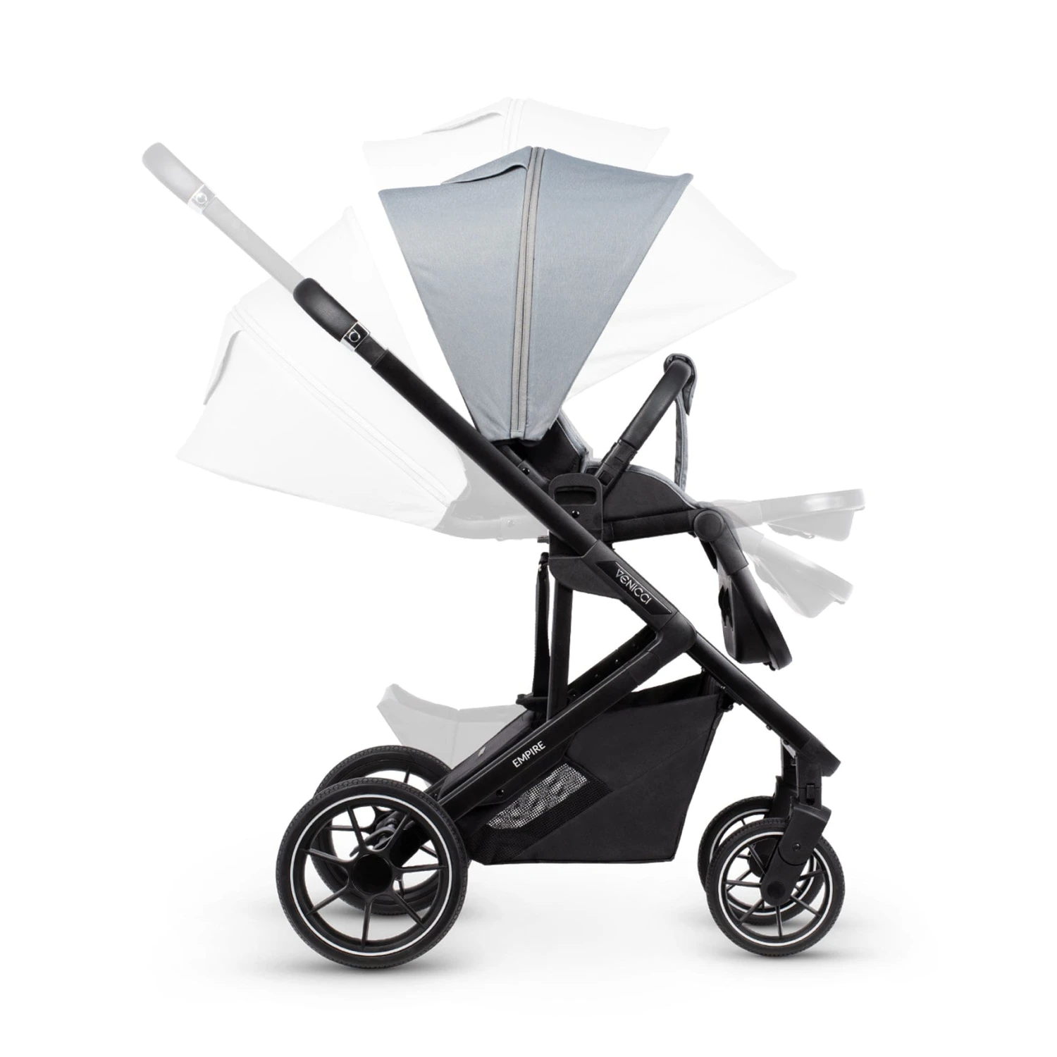 The Empire stroller has an easy one hand fold, that becomes a compact and handy suitcase that has an extendable handle which allows you to easily carry it. The seat unit features an adjustable reclining backrest and hood to let your little one kick back and relax or nap.