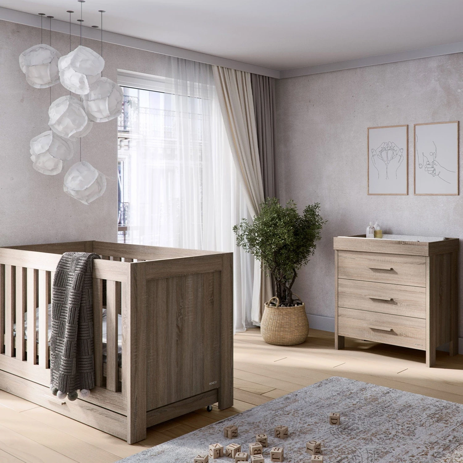 This wooden design is universal and versatile, and can perfectly fit into any nursery style. The Truffle Oak colour is a distinctive shade that would fit well with darker arrangements and with lighter ones.
