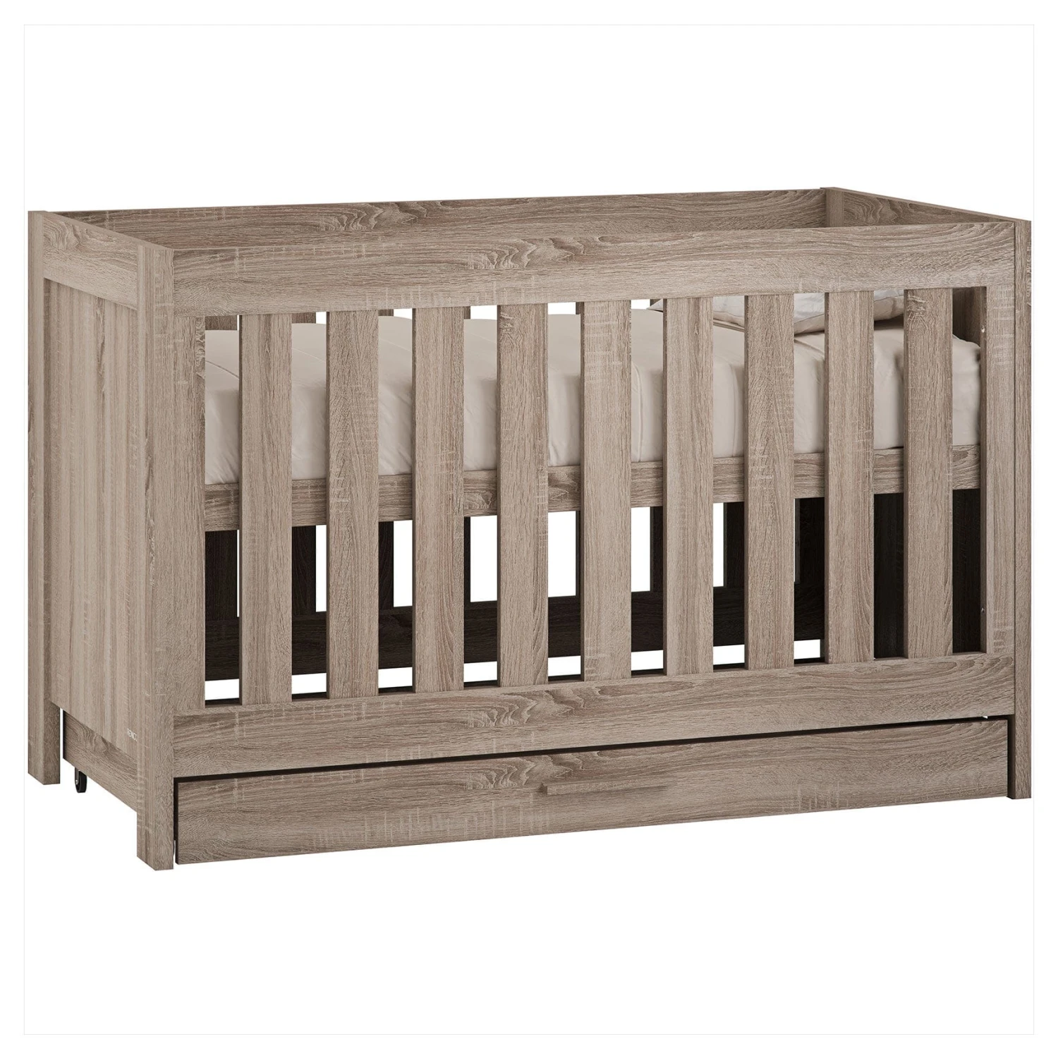 The Venicci Forenzo Cot Bed with Drawer – Truffle Oak uses a wooden design for a peaceful and cosy feel. This cot bed was designed with you in mind too, not just baby. It supports their healthy development as well as your back! The lack of unnecessary shelves in this furniture means less dust around baby and less for you to clean!