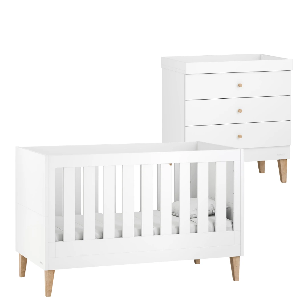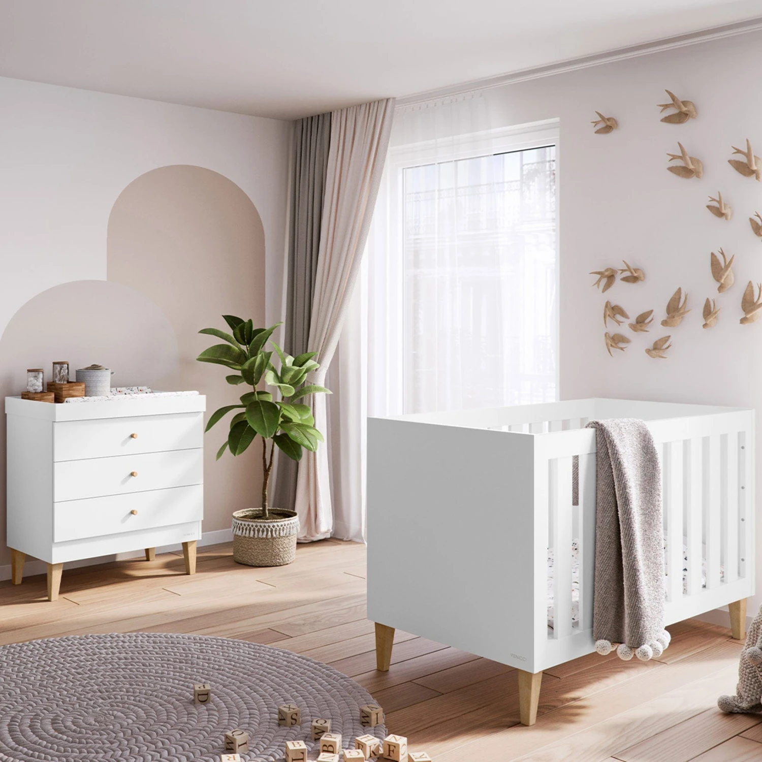 The Venicci Saluzzo 2 Piece Dresser Roomset – Premium White has a hybrid Scandinavian style which feels modern yet simple. This room set was designed with you in mind too, not just baby. It supports their healthy development as well as your back! Minimalism supports allergy sufferers, due to the raised furniture on legs as well as the lack of unnecessary shelves.Â
