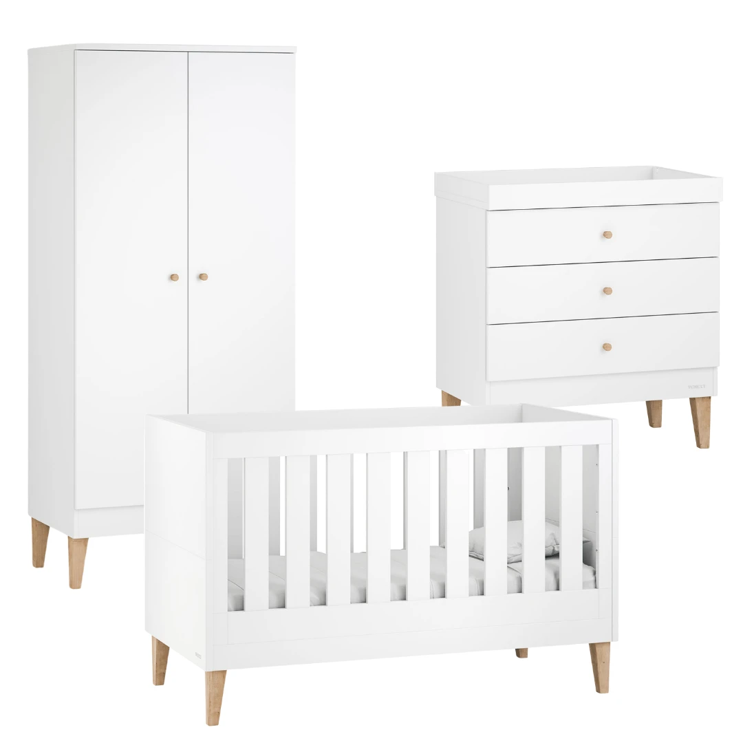 The room set will last you and baby from birth, the crib is suitable until they reach four years and the wardrobe and dresser are able to be used for years later. The legs and handles of this room set are made from varnished oak, helping with the cosy feel of your nursery.Â