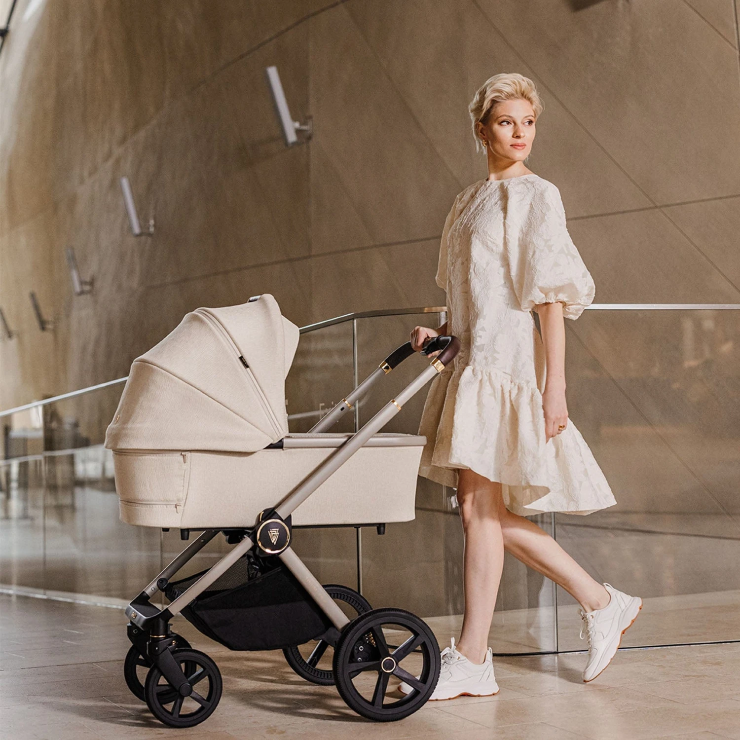 The fabric is beautifully designed with embellishments that are sure to stand out as well as being water repellant and UV50. It also has a built-in panoramic ventilation panel inside the carrycot. All finished off with a telescopic handle with an elegant finish. This all comes with a cosy footmuff for those winter months, a large and stylish bag with an additional removable sachet and a capacious shopping basket with an additional insert.